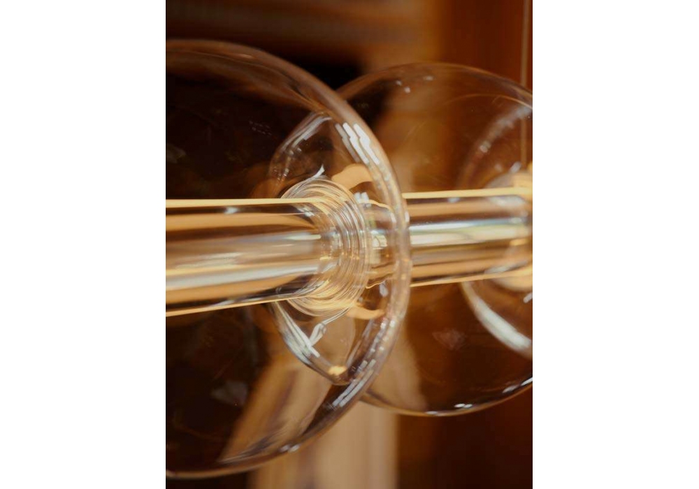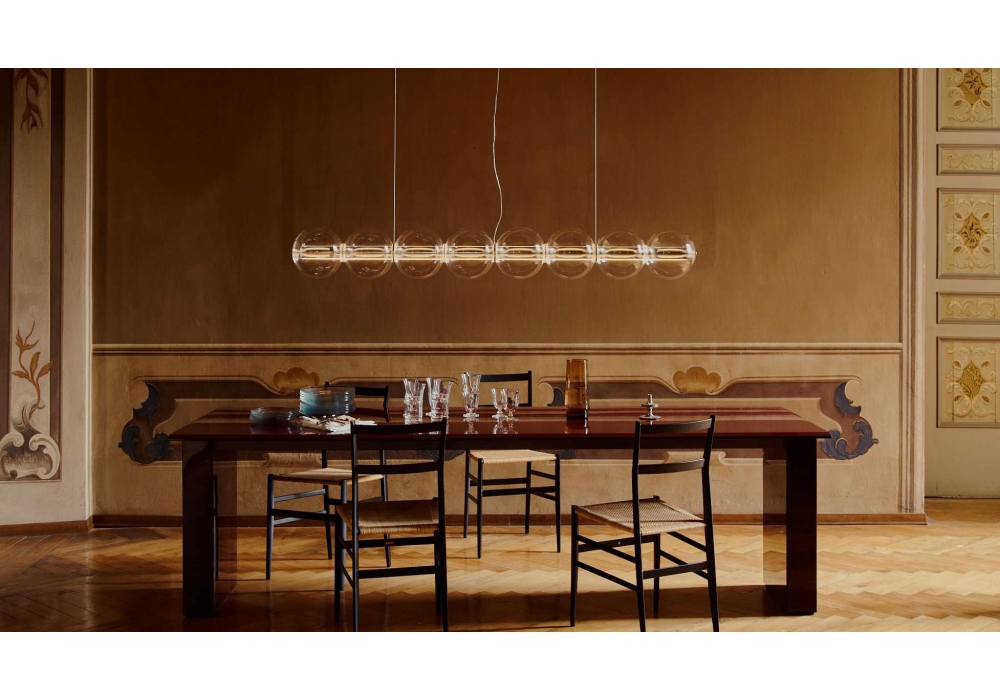 Luce Sferica diseñada por Ronan Bouroullec para Flos es una lámpara de suspensión con estructura de aluminio extruido pulido y módulos esféricos de vidrio borosilicato transparente. Fuente de alimentación integrada en el rosetón. Botón de control táctil, situado en un extremo del producto, para controlar el dispositivo en tres modos diferentes.