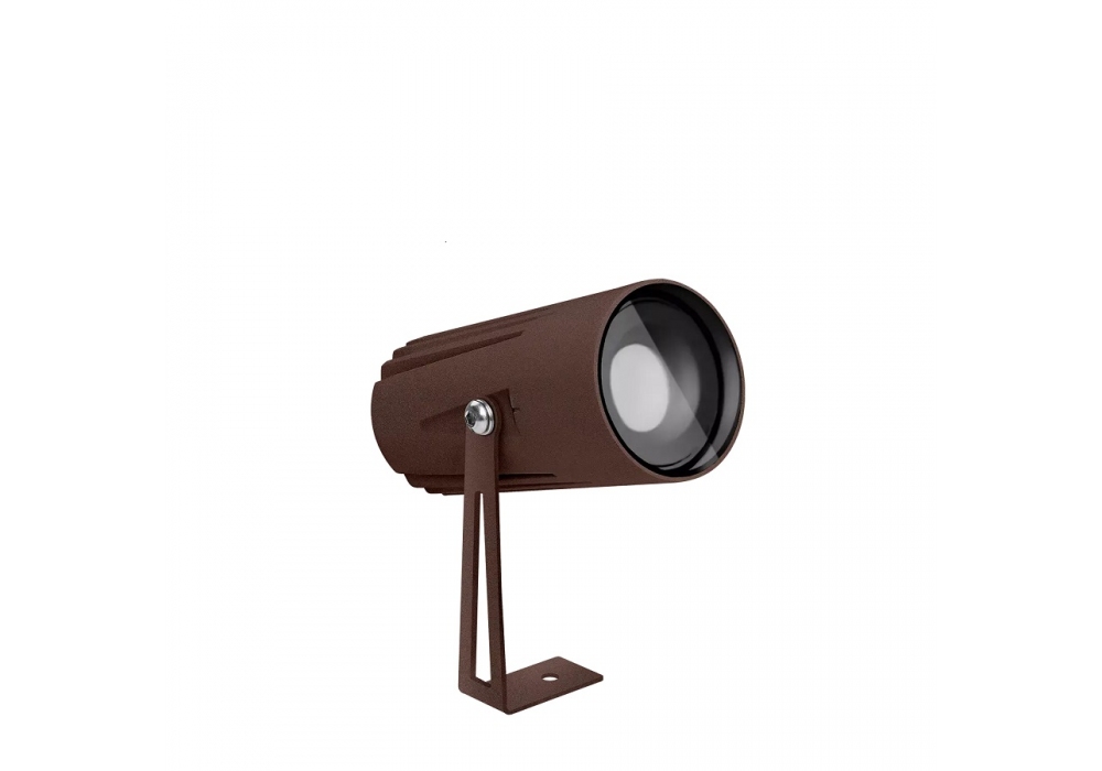 Shaker 8 diseñado por Linea Light es un proyector de exterior de un solo haz fabricado en aluminio fundido a presión con acabado marrón oscuro y un difusor de vidrio templado extraclaro. Incluye una pica de acero AISI 304.
