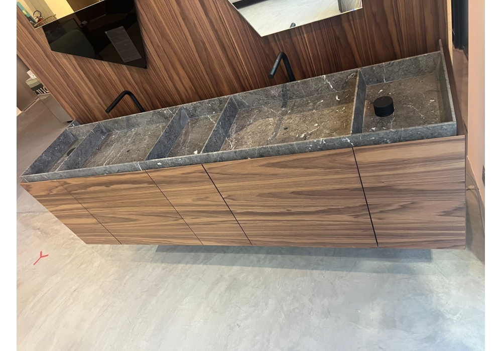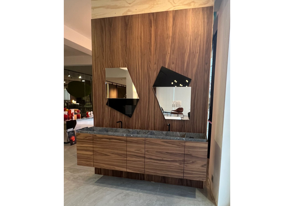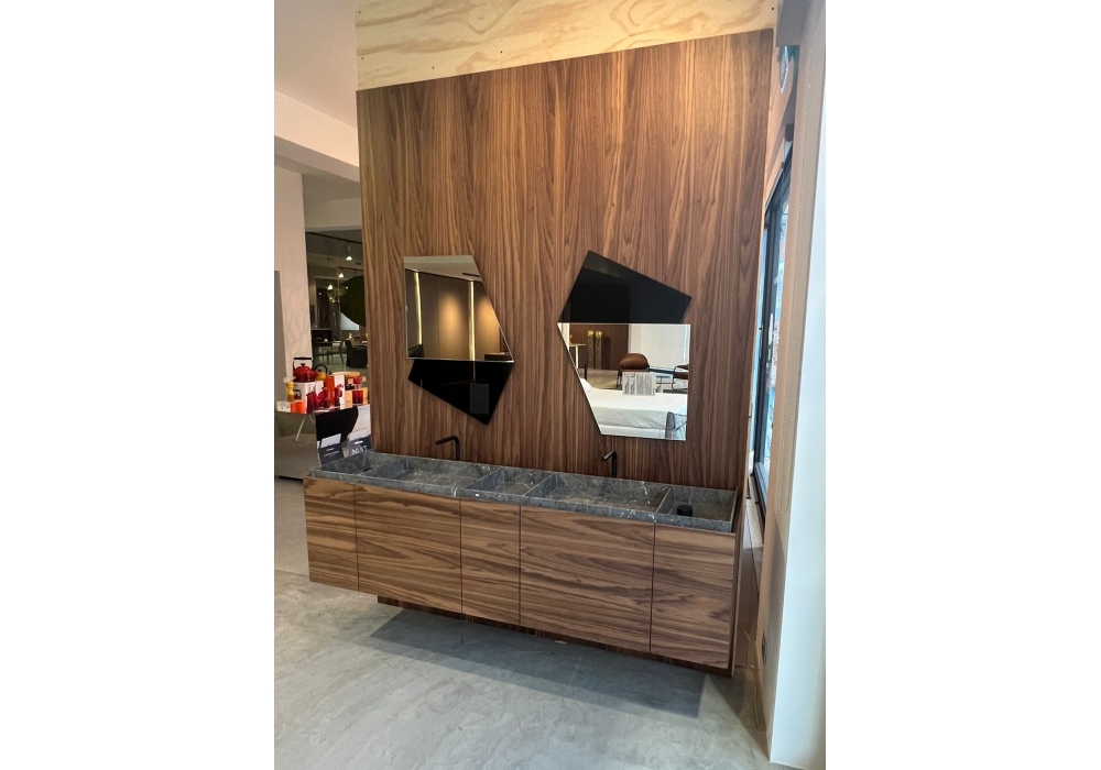 El sistema de baño de Antonio Lupi, fabricado con paneles de contrachapado de Nogal Canaletto, incluye un mueble de lavabo con cajones y laterales de Nogal Canaletto en acabado Skin Cenere, complementado con una elegante encimera de mármol Grigio Imperiale. El sistema incluye dos espejos con retroiluminación LED, un sifón regulable negro mate y dos caños de sobremesa con grifo monomando de acero inoxidable AISI 316/L lacado mate, complementado con elegantes manetas cilíndricas.