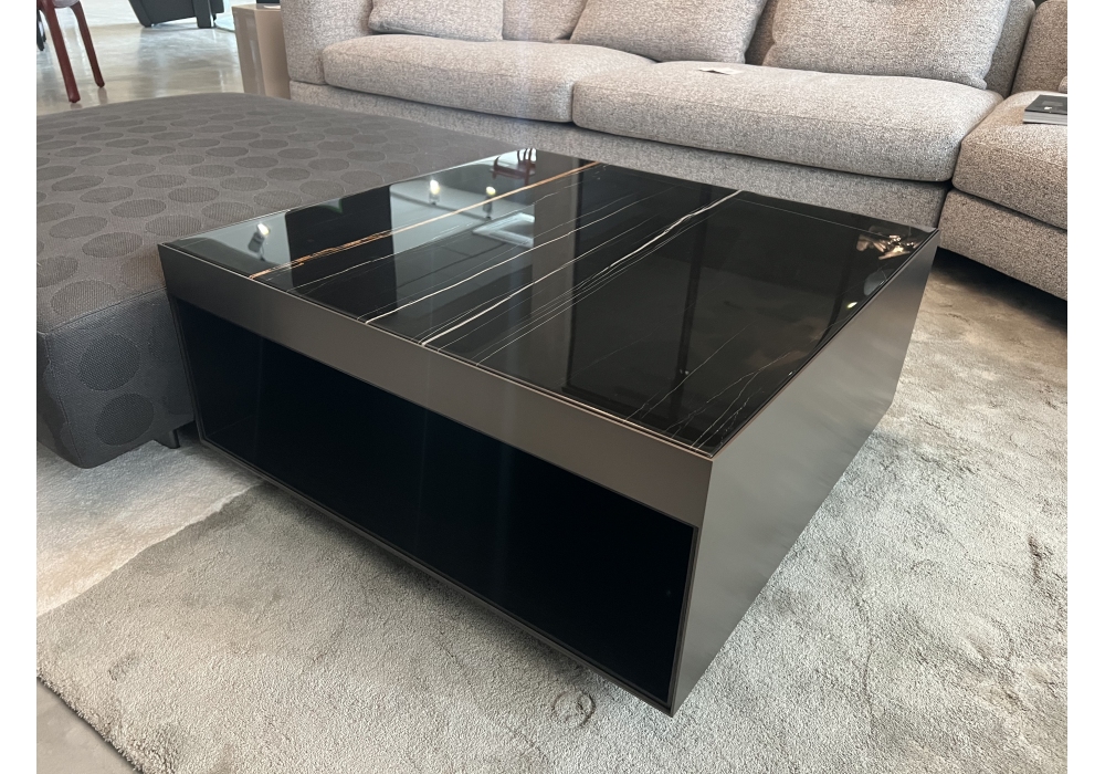 Elliott diseñada por Rodolfo Dordoni para Minotti es una mesita realizada con tapa de mármol Sahara noir y estructura de bronce.