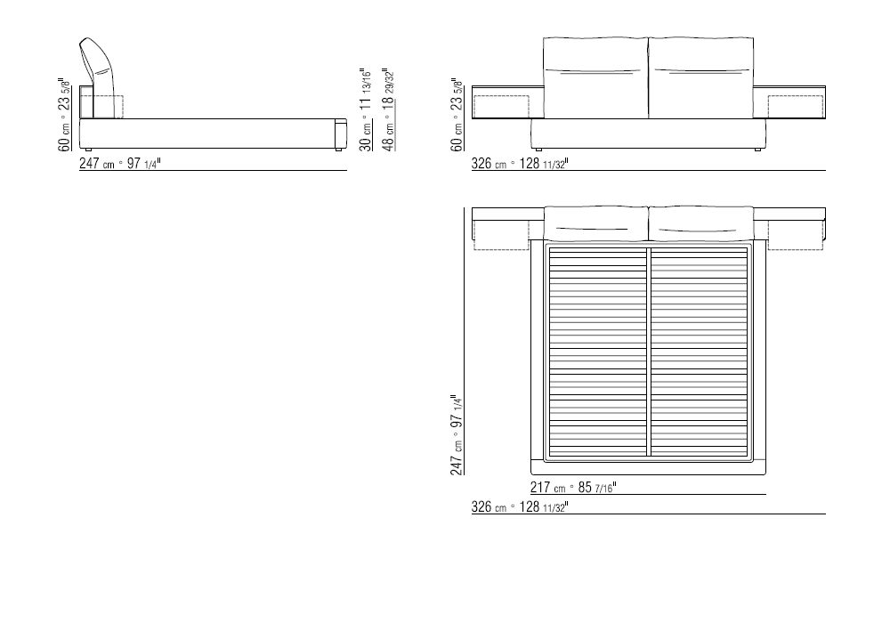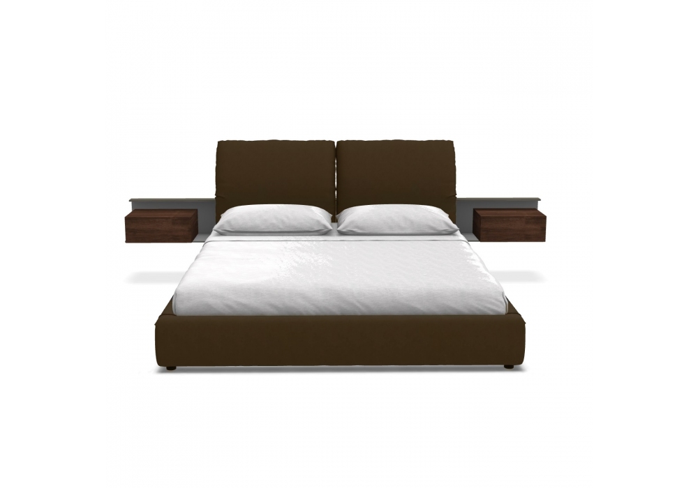 Newbridge diseñada por Carlo Colombo para Flexform es una cama con estructura en gris ratón perlado y tapizado de piel, combinada con detalles en piel de color oliva. Incluye somier de láminas. La cama viene con dos muebles auxiliares con cajones (50 x 38 x 20 cm de altura) en nogal Canaletto teñido en color café.