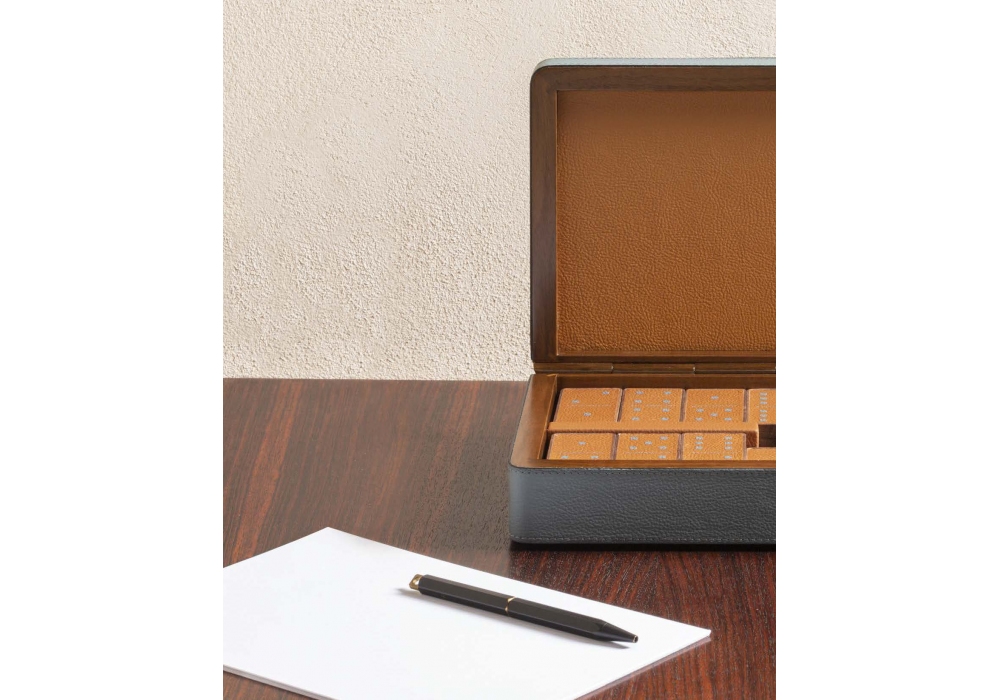Caja de madera Domino diseñada por Giobagnara x Poltrona Frau. Las fichas de dominó están realizadas en madera de nogal con finas incrustaciones de cuero y están contenidas dentro de un estuche de madera de nogal revestido de cuero. Totalmente elaborado en Pelle Frau®.