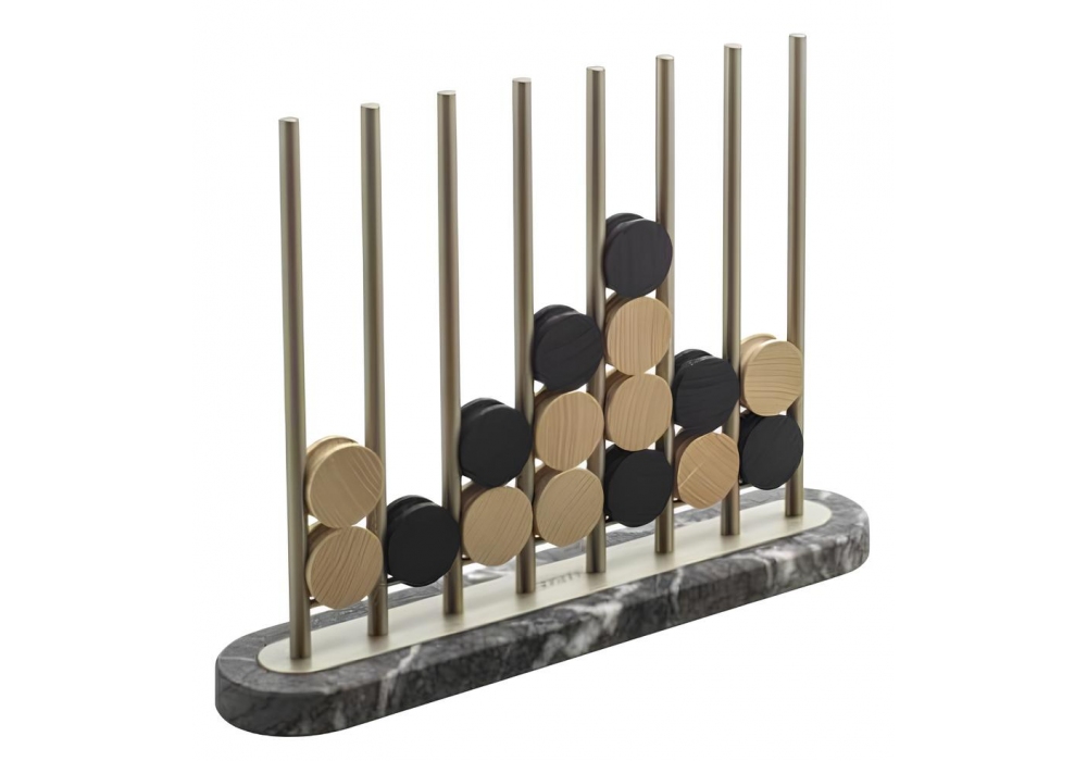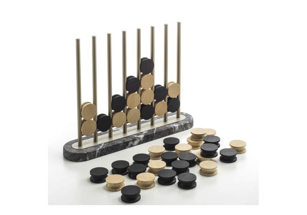 Chiaroscuro diseñado por David Lorenzo Dolcini para Porada es un juego de mesa con base en mármol gris Carnico, estructura en aluminio anodizado acabado Champagne y peones en fresno.