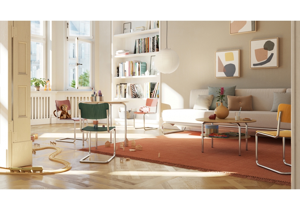 S 43 K diseñada por Mart Stam (copyright artístico) para Thonet es una silla para niños, con estructura de tubo de acero cromado. Asiento y respaldo en contrachapado de haya perfilado, disponible en diferentes acabados.
