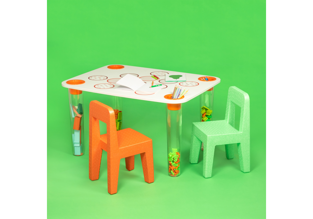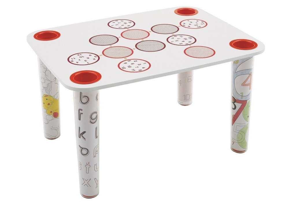 Little Flare Circle diseñada por Marcel Wanders para Magis Me Too es una mesa con tablero de MDF cubierto con hoja de polímero, perforado para alojar las bandejas para rotuladores. Patas en policarbonato transparente neutro. Disponible con o sin bandeja de rotuladores ABS.