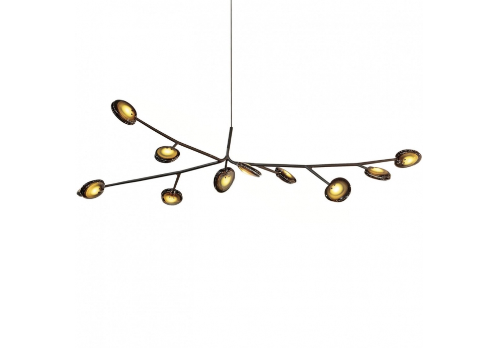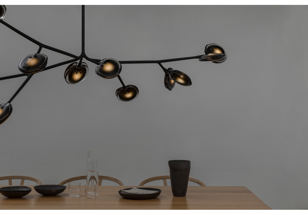 Serie 16 diseñada por Omer Arbel para Bocci es una lámpara de techo disponible en diferentes versiones. La serie 16 consta de un armazón modular que conecta los difusores de vidrio, o las hojas, a través de una estructura pintada de negro mate que se desarrolla en una serie de ramas y tallos. Cada segmento transporta energía de bajo voltaje y se despliega en diferentes ramas, para permitir el desarrollo horizontal y vertical en una variedad infinita de formas posibles. Cada hoja es una obra maestra de ingenio y artesanía y está disponible en 4 acabados diferentes.
