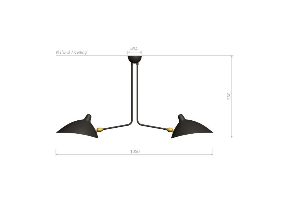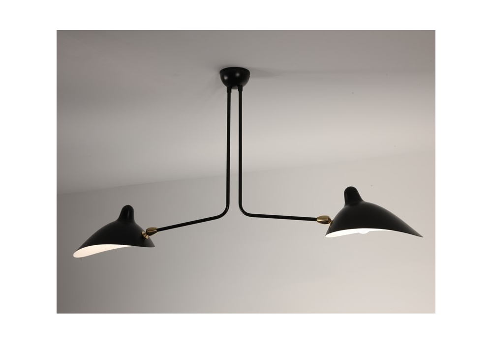 P2B diseñada por Serge Mouille es una lámpara de techo, la reedición original del modelo 1959. Tiene 2 brazos en acero pintado negro, el reflectors de aluminio lacado negro con interior blanco. Bombilla: E27 2x42W halógeno (incluida).