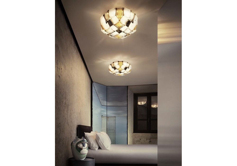 Mida diseñada por Adriano Rachele para Slamp es la lámpara circular de techo o pared realizada en Lentiflex®,Opalflex®,Goldflex®,Steelflex® o Copperflex®. La fuente de luz utilizada es del tipo LED de filamento regulable. Mida está disponible en diferentes acabados.