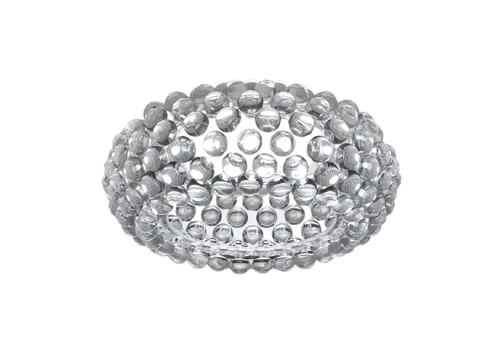 Caboche Plus diseñada por Patricia Urquiola y Eliana Gerotto para Foscarini es una lámpara de techo compuesta por esferas en polimetilmetacrilato transparente o gris. La fuente de luz adoptada es de tipo LED disponible en diferentes versiones.