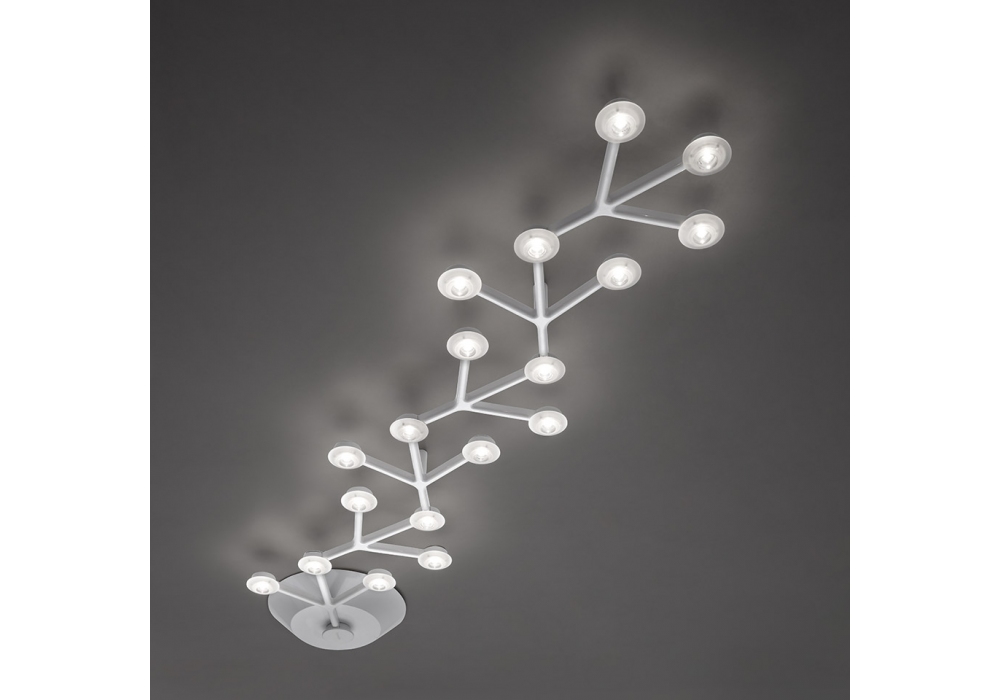 Led Net Line 125 diseñada por Michele De Lucchi y Alberto Nason para Artemide es una lámpara de techo con estructura lineal que se bifurca y se expande en diferentes direcciones realizada en metacrilato y aluminio blanco brillo. La fuente de luz adoptada es LED con sistema de regulación Push & App gestionable de forma remota.