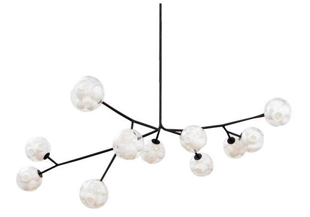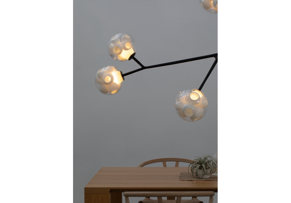 38V diseñada por Omer Arbel para Bocci es una lámpara de techo con estructura tubular en acero inoxidable y acabado soft touch negro mate. Los difusores son de vidrio soplado con fuente de luz LED. 38V está disponible en diferentes versiones.