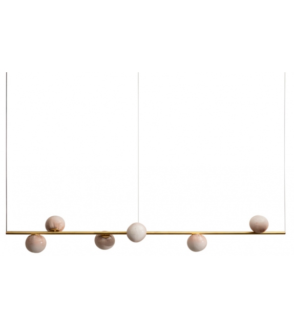 84V Stem diseñada por Omer Arbel para Bocci es una lámpara de techo con estructura tubular de latón disponible en dos acabados diferentes, latón o negro mate. El difusor es de vidrio soplado con fuente de luz LED. 84V Stem está disponible en diferentes versiones y tamaños.