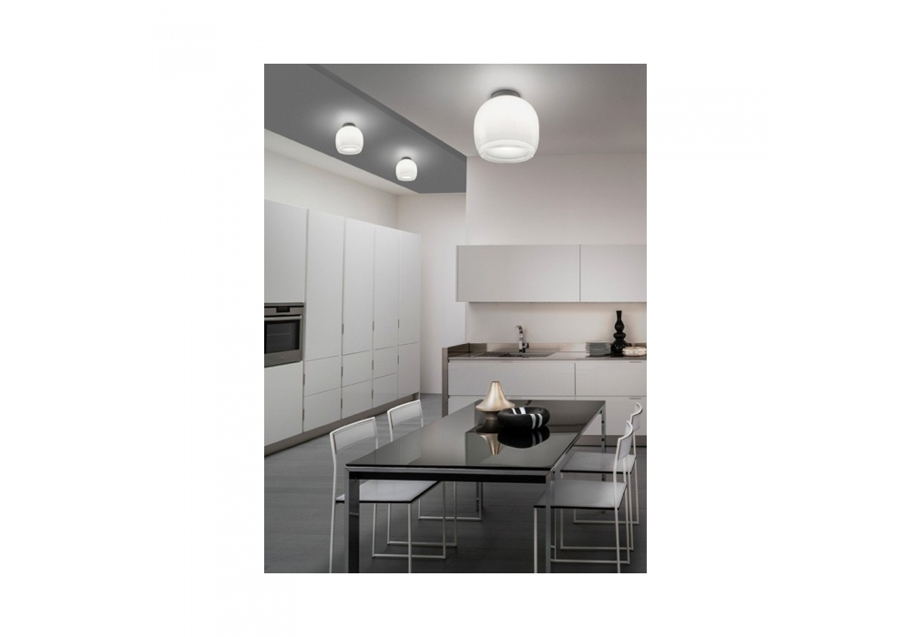 Implode diseñada por Gregorio Spini para Vistosi es una lámpara de techo con estructura portante en metal blanco brillo. El difusor es de cristal con forma cilíndrica acampanada en acabado blanco/cristal y adopta una fuente de luz regulable halógena o LED con casquillo E27. Implode está disponible en diferentes modelos.