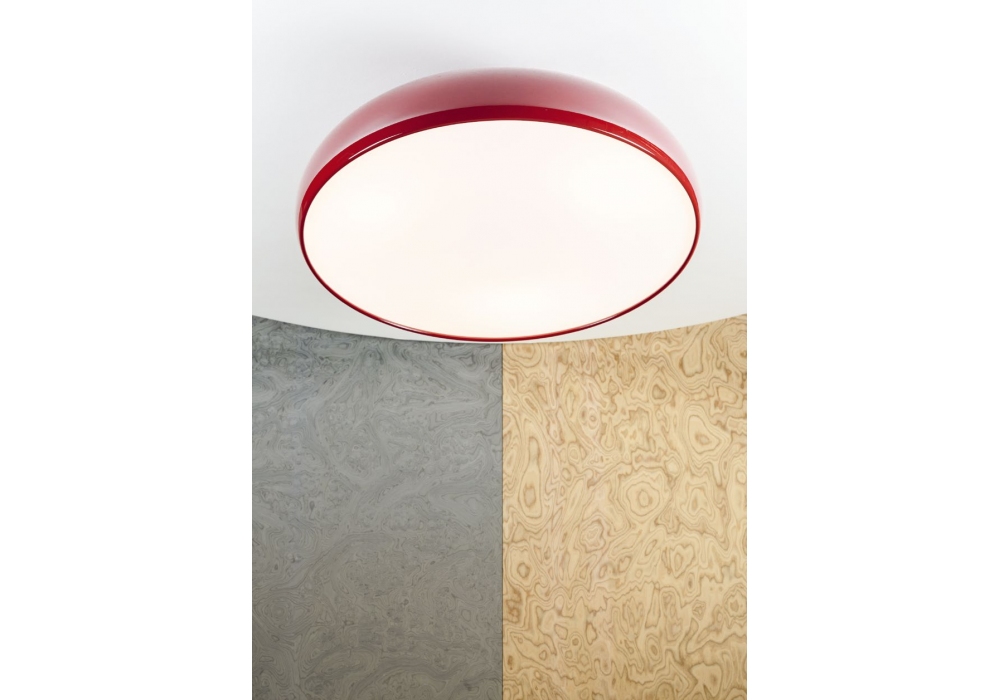 Pangen diseñada por Archivo Histórico para Fontana Arte es una lámpara de techo con estructura de anclaje en metal cromado. El difusor superior es de metal pintado en tres acabados diferentes: blanco, negro o rojo, mientras que el difusor inferior es de policarbonato opalino.