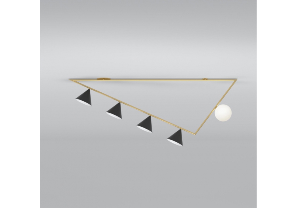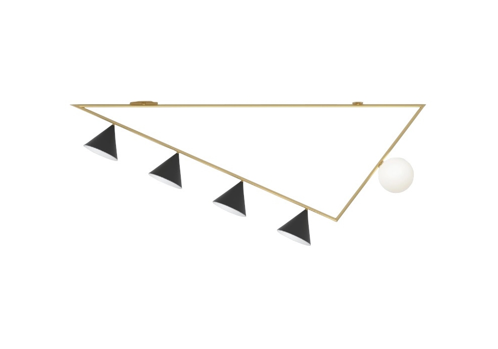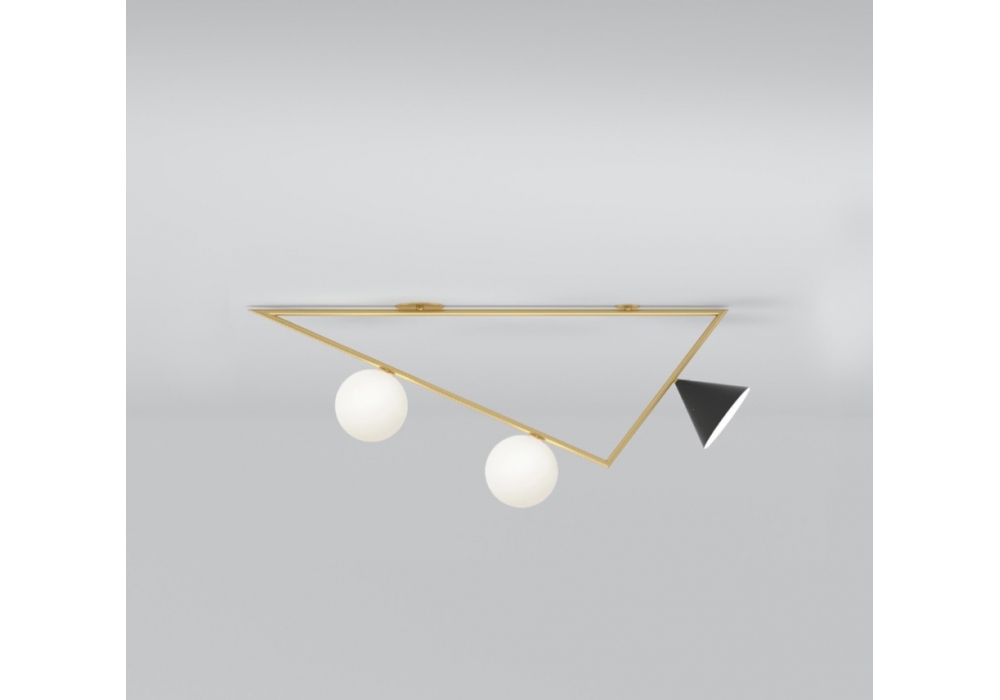 Triangle 2 diseñada por Atelier Areti es una lámpara de techo con estructura en latón cepillado, esferas de cristal blanco y conos de metal pintado de negro. La lámpara está disponible en diferentes modelos.