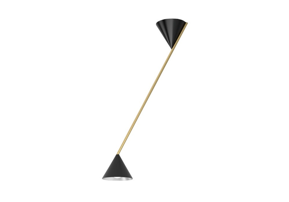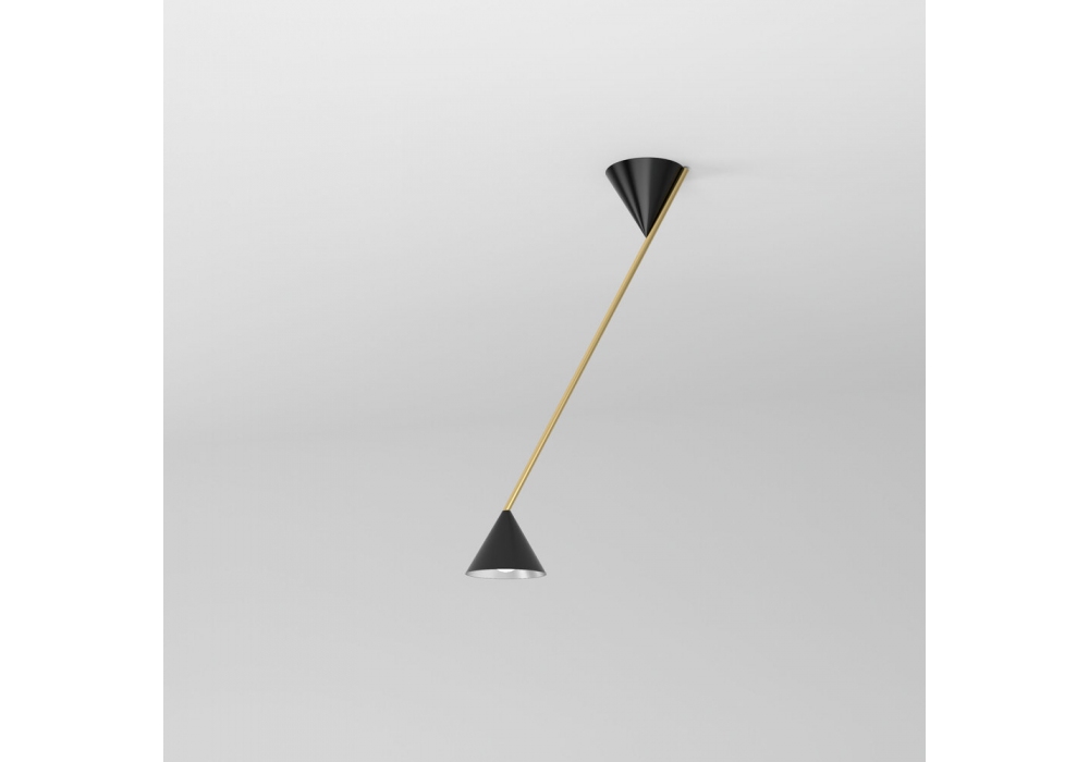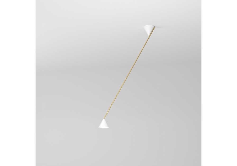 Hat Light diseñada por Atelier Areti es una lámpara de techo con estructura en latón cepillado o níquel, conos en metal pintado de negro o blanco y reflector en acabado blanco o latón. Disponible en dos tamaños.