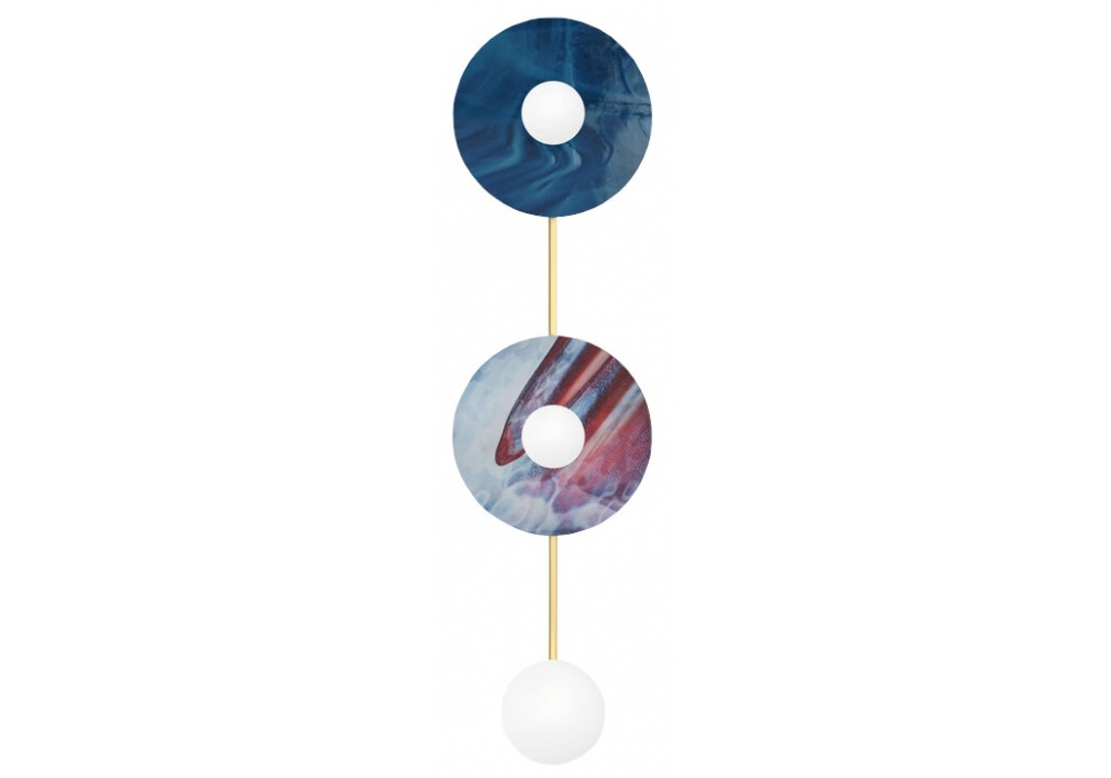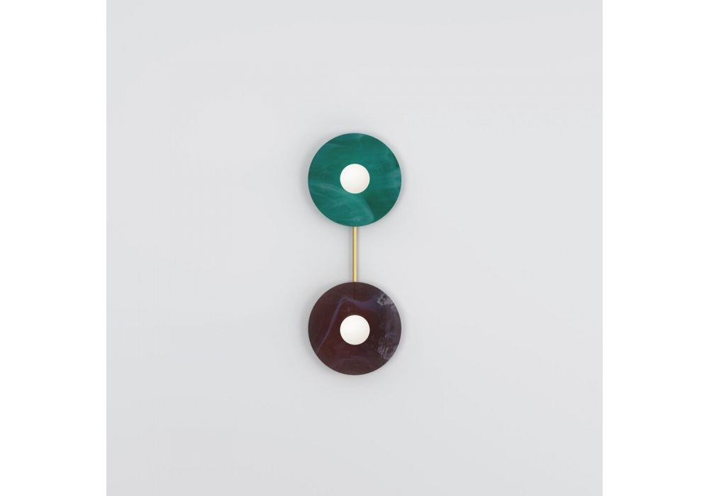 Disc and Sphere Glass diseñada por Atelier Areti es una lámpara de techo realizada en latón cepillado, disco de vidrio coloreado y globos de vidrio blanco. Disponible en diferentes versiones.