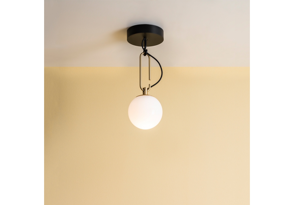 NH diseñada por Neri&Hu para Artemide es una lámpara de techo con difusor esférico realizado en vidrio soplado blanco y aro de latón cepillado anclado a un rosetón circular. La fuente de luz adoptada es de tipo LED regulable. NH está disponible en diferentes tamaños.