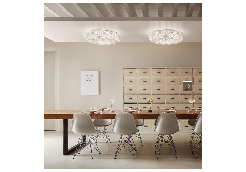 Lavie Mini diseñada por Adriano Rachele para Slamp es una lámpara de techo o de pared circular realizada íntegramente en Lentiflex® u Opalflex® en diferentes acabados. La fuente de luz adoptada es del tipo LED regulable. Lavie está disponible en diferentes tamaños.