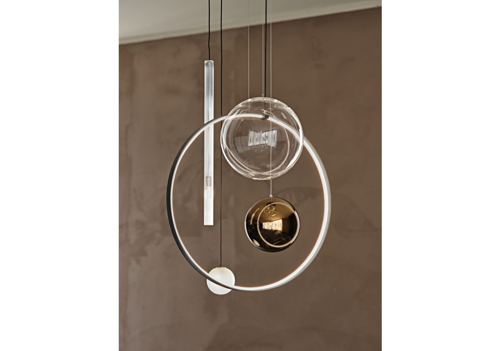 Biarritz diseñada por Oriano Favaretto para Cattelan Italia es una lámpara de techo con pantallas en vidrio borosilicatado transparente, bronce y arenado. Pantalla acanalada de vidrio borosilicado. Estructura en acero barnizado iron grey satinado. Soporte de techo en acero barnizado gofrado titanio.
