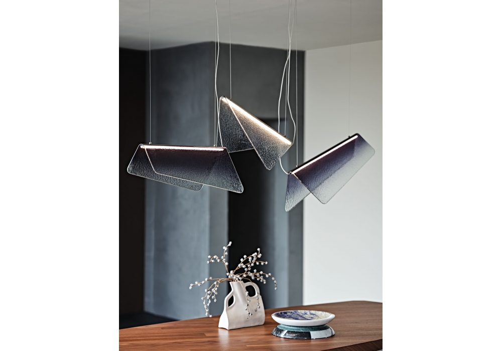 Velar diseñada por Carlo Rocchetti para Cattelan Italia es una lámpara de techo LED con pantalla en cristal decorado artísticamente, transparente o azul fumé. Placa de techo de acero cromado negro.