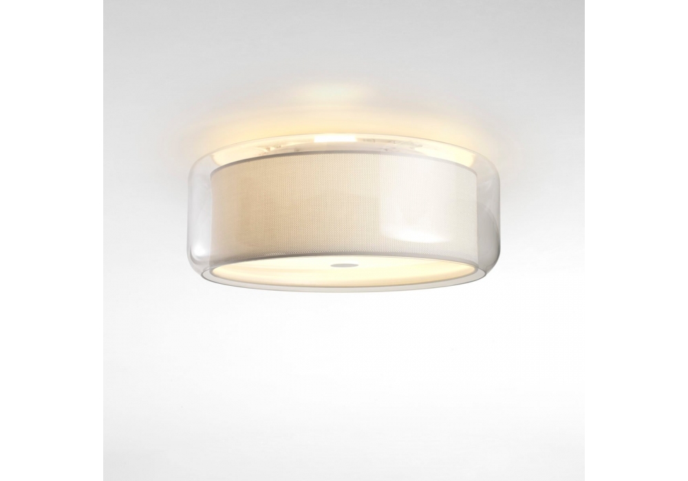 Mercer C diseñada por Joan Gaspar para Marset es una lámpara de techo con estructura de vidrio soplado y difusor interno de tela. Disponible en diferentes acabados.
