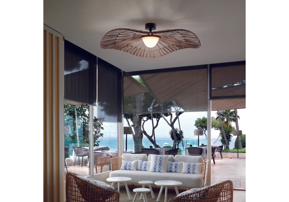 Mediterrània Outdoor diseñada por Alex Fernández Camps para Bover es una lámpara de techo de exterior con soporte y estructura portante en metal pintado y aluminio. La pantalla es de fibra sintética de color marrón con difusor de policarbonato y apantalla una fuente de luz tipo LED con sistema de regulable Triac.