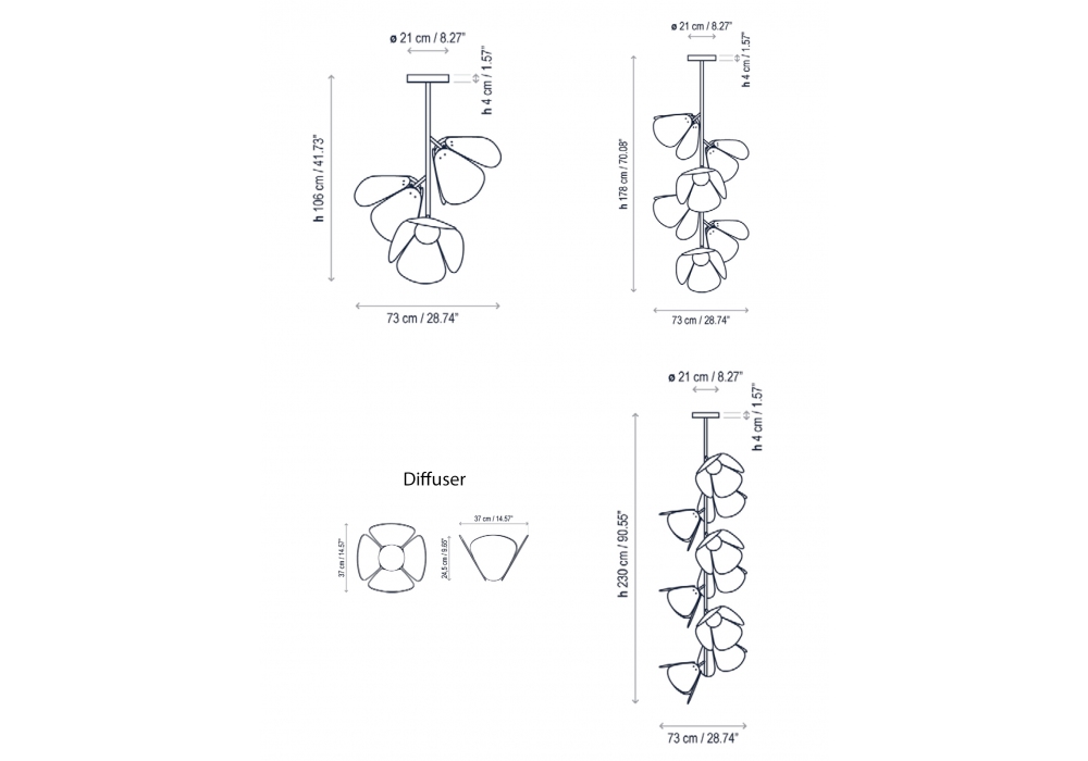 Mod diseñada por Lázaro Rosa-Violán para Bover es una lámpara de techo con soporte y estructura portante en metal y aluminio pintado. La pantalla pétalo está fabricada en aluminio con difusor de polietileno y apantalla una fuente de luz LED con sistema de regulable Triac. Mod está disponible en diferentes modelos y acabados.
