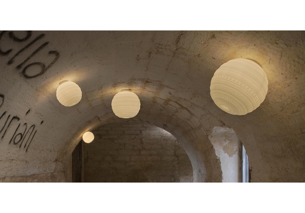 Braille diseñada por Matteo Ugolini para Karman es una lámpara de techo en vidrio blanco satinado. Disponible en diferentes dimensiones. Lámpara no incluida.