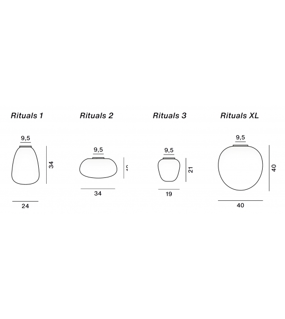 | Dimensiones | Ø 24 x H 34 cm (Riatuals1); Ø 34 x H 19 cm (Riatuals2); Ø 19 x H 21 cm (Riatuals3); Ø 40 x H 40 cm (Riatuals XL). |
