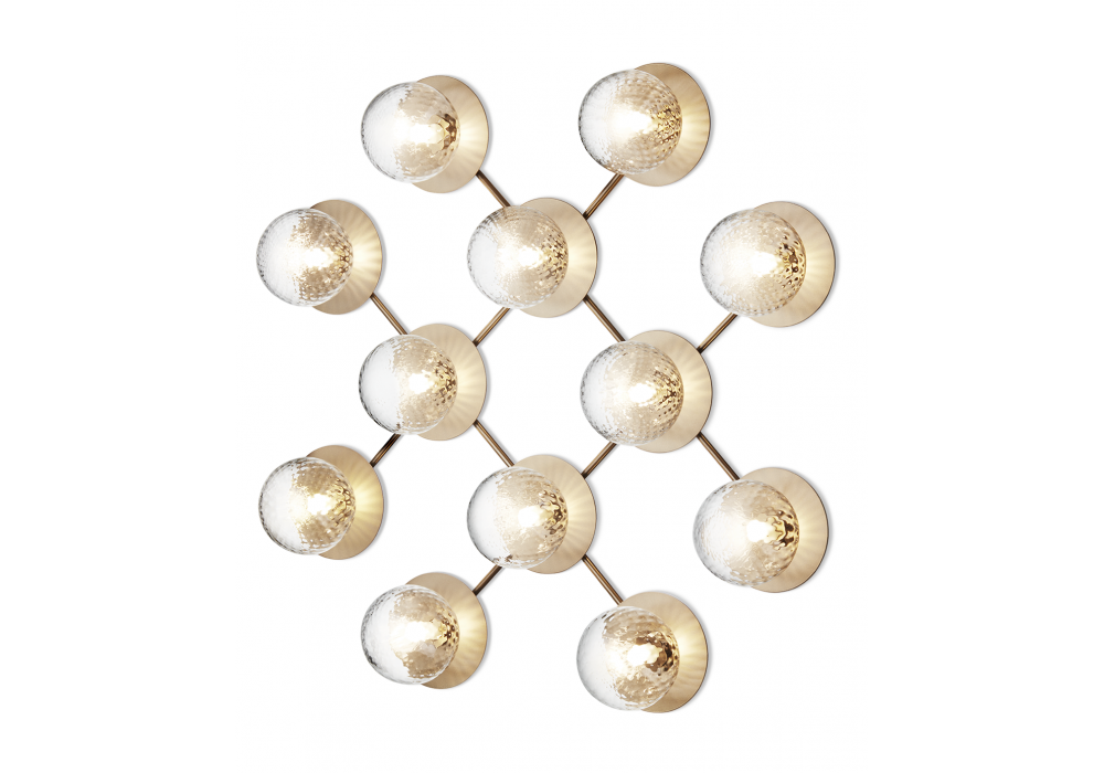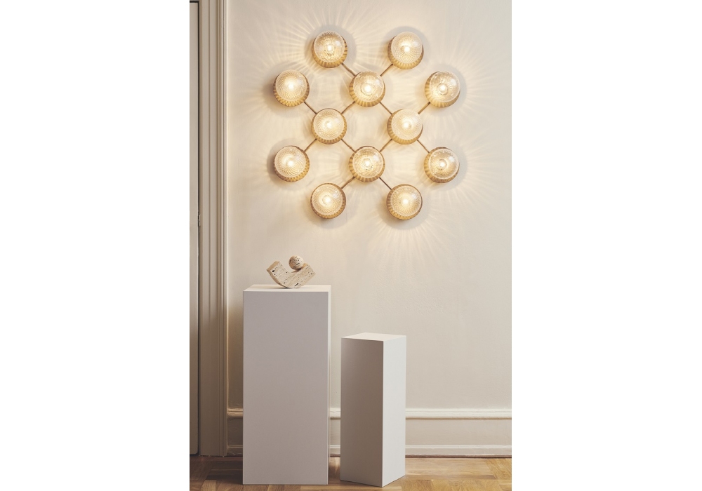 Liila diseñada por Sofie Refer para Nuura es una lámpara de pared/techo modular con estructura de metal y difusores en vidrio soplado opalino o transparente con motivos en relieve.