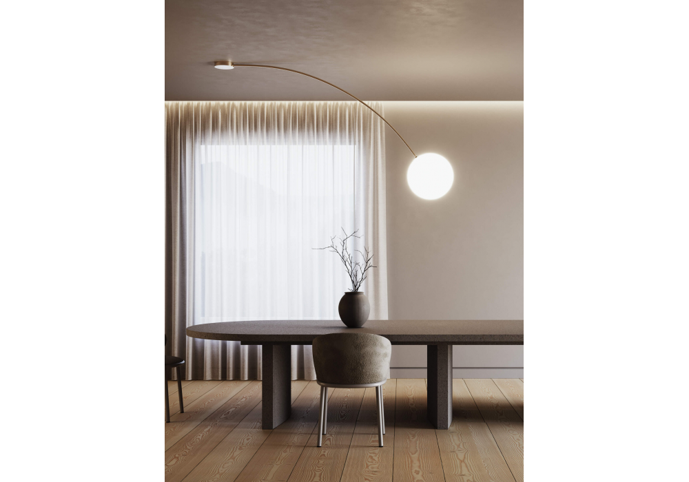 Filo diseñada por Defne Koz y Marco Susani para Italamp es una lámpara de techo LED con difusor de vidrio soplado blanco y estructura de metal en acabado oro claro cepillado o negro mate.