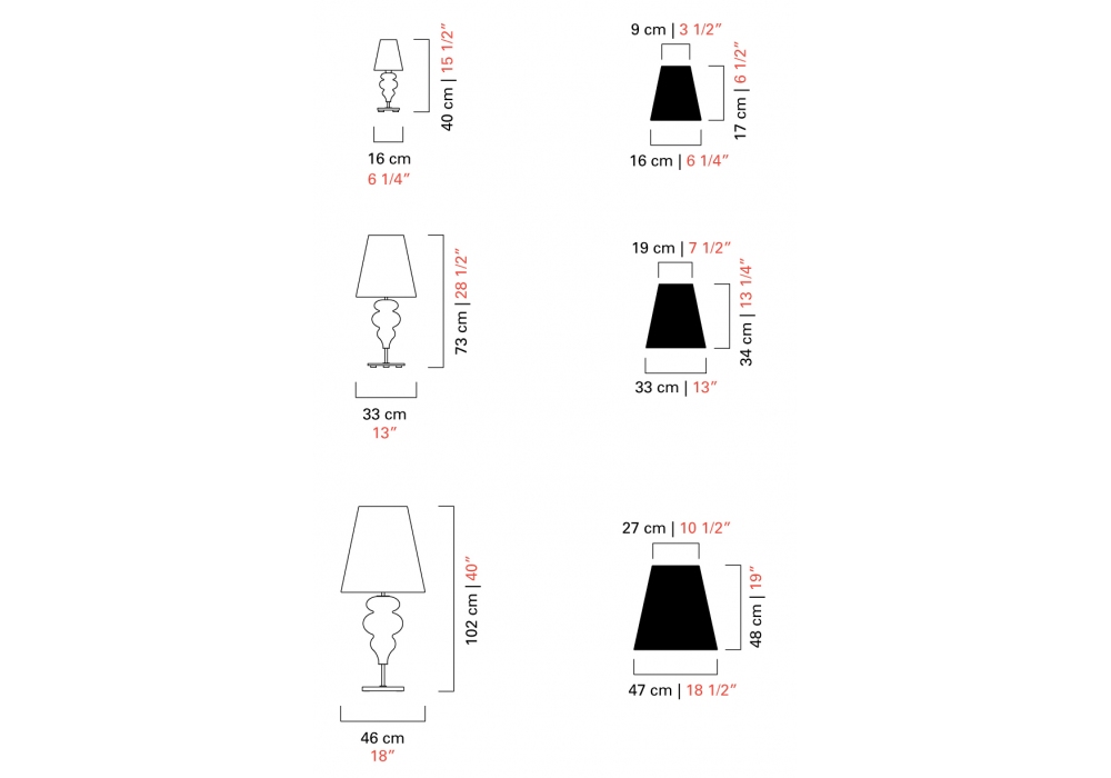 | Dimensiones | Ø 16 x H 40 cm; Ø 33 x H 73 cm; Ø 46 x H 102 cm. |