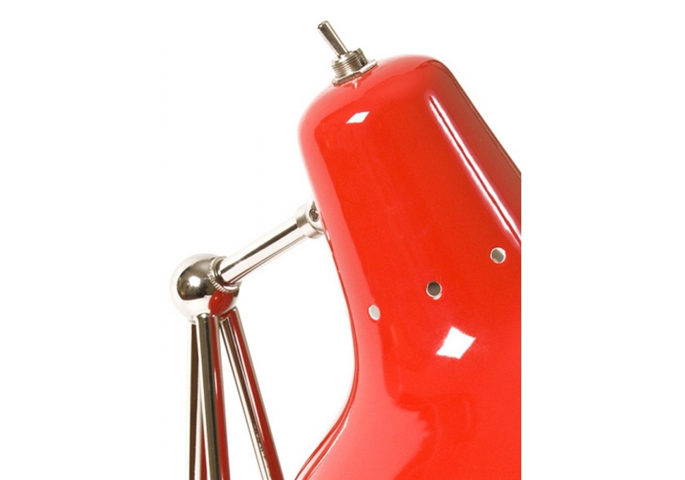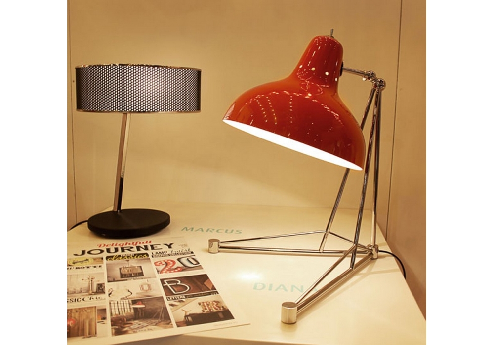 Diana diseñada por DelightFULL es una lámpara de mesa hecha a mano construida con materiales como el latón y el aluminio. Para el cuerpo se utilizó latón, mientras que para la pantalla se eligió aluminio. La pantalla de aluminio está lacada en rojo brillo por fuera y blanco mate por dentro, mientras que para el cuerpo se ha optado por un acabado niquelado.