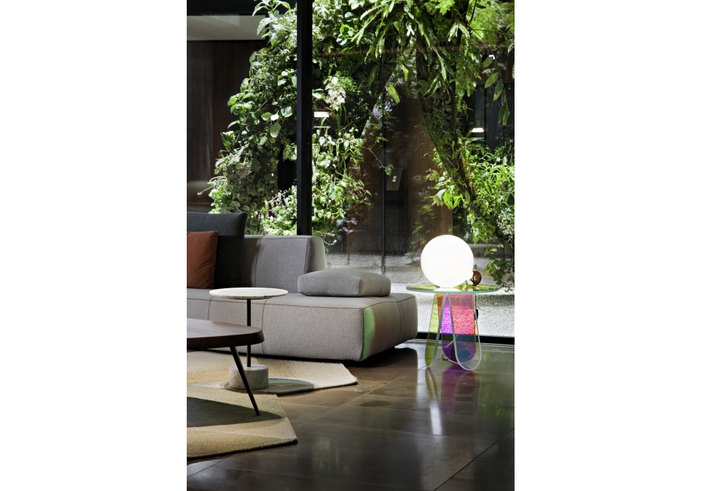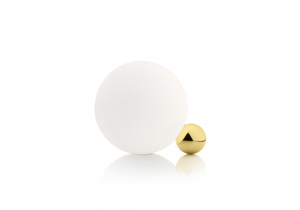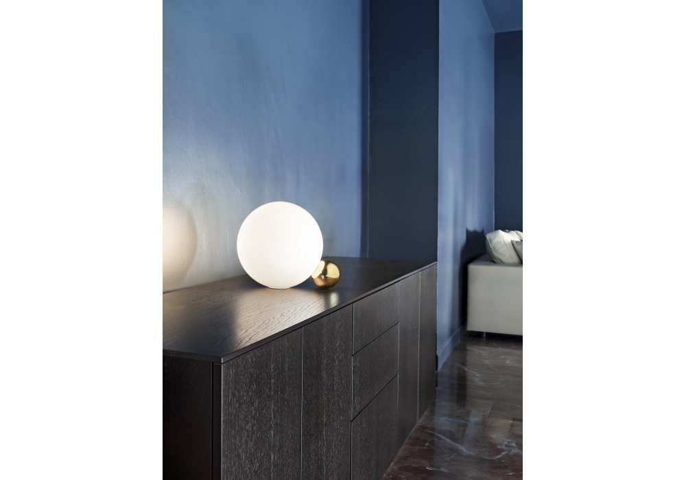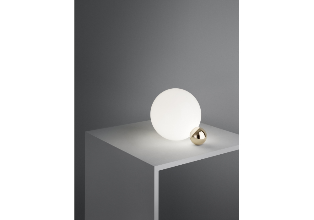 Copycat diseñada por Michael Anastassiades para Flos es una lámpara de mesa compuesta por una esfera de aluminio mecanizado a partir de una pieza sólida y bañada en oro de 24 K. Difusor opalino de vidrio soplado. Fuente de luz LED con regulador de intensidad a lo largo del cable de alimentación.