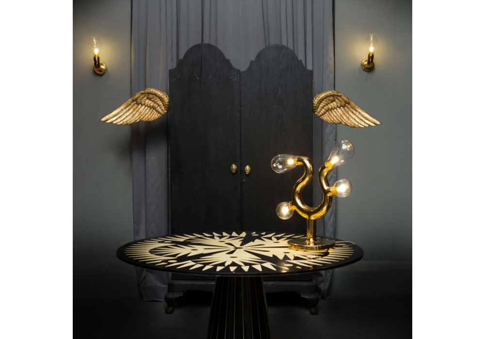 The Four Bulb diseñada por Matteo Cibic para Scarlet Splendor es una lámpara LED de color blanco cálido. Está realizado en cerámica con acabado en oro de 24K y cristal soplado a mano.