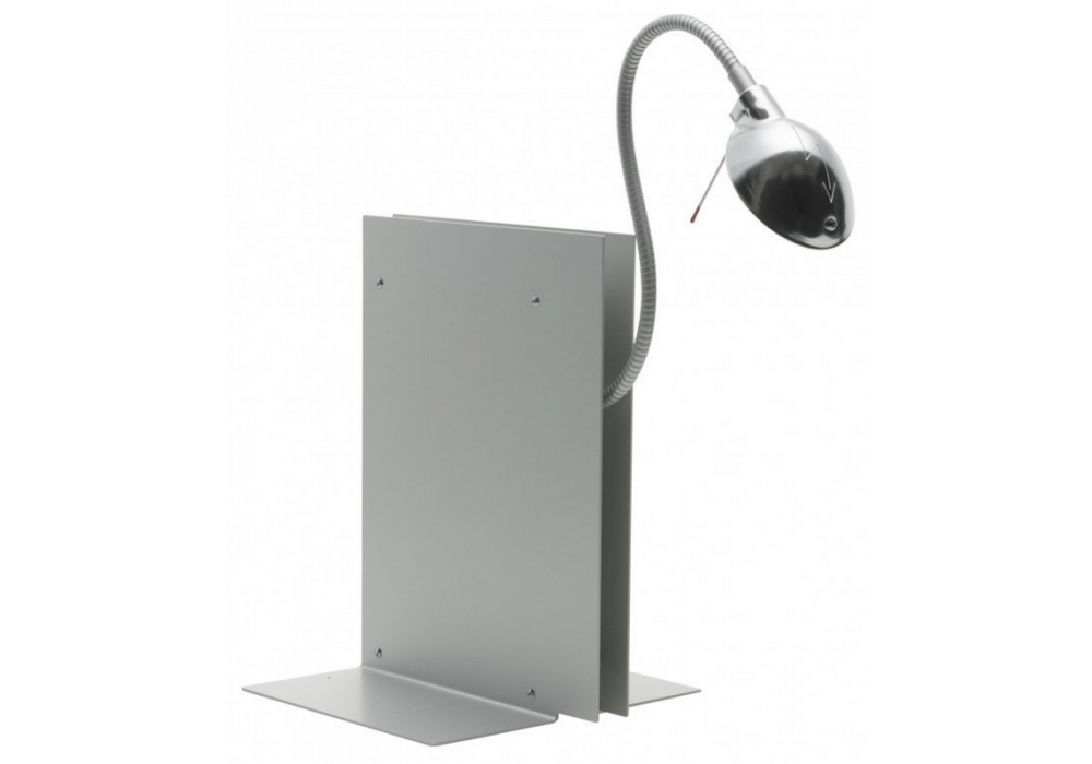 Oskar diseñada y producida por Ingo Maurer es una lámpara de mesa con estructura en metal y aluminio anodizado y reflector con cristal protector. El brazo flexible de metal permite el ajuste variable del reflector.