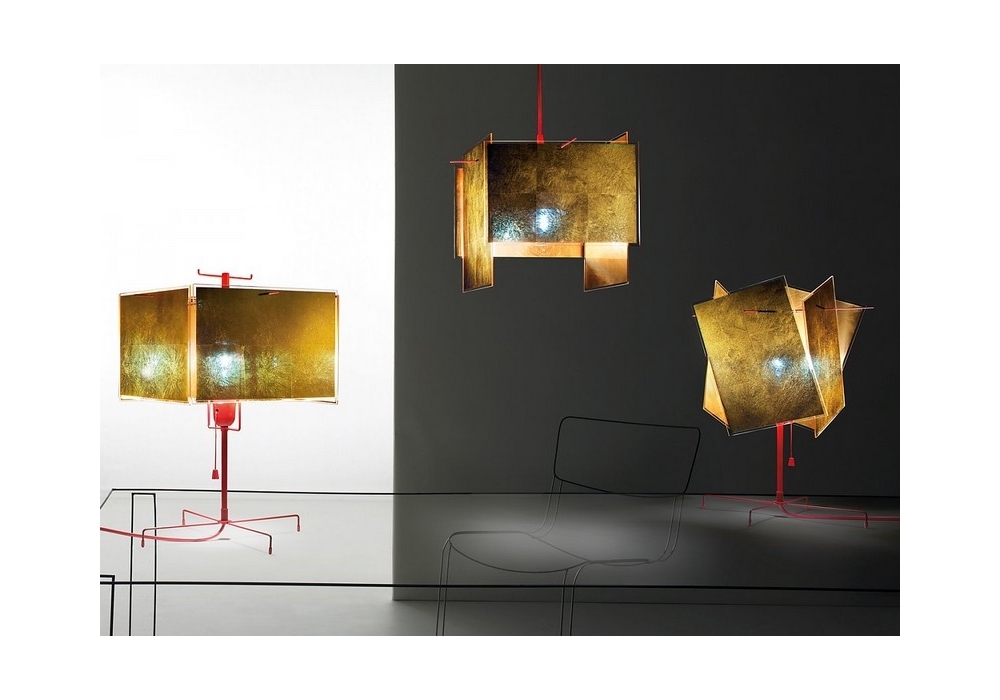 24 Karat Blau T diseñada por Alex Schmid para Ingo Maurer es una lámpara de mesa con estructura de metal, difusor realizado con 4 pantallas de pan de oro laminado, que se pueden colgar en la barra transversal en varios ángulos y posiciones.