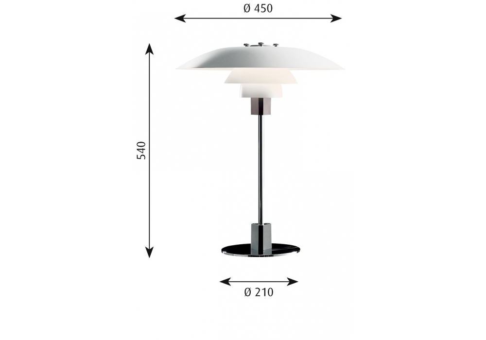 PH 4/3 diseñada por Poul Henningsen para Louis Poulsen es una lámpara de mesa con base circular y estructura portante en latón estirado y cromado. Los difusores son de aluminio centrifugado y apantallan una fuente de luz LED o halógena con casquillo E27.