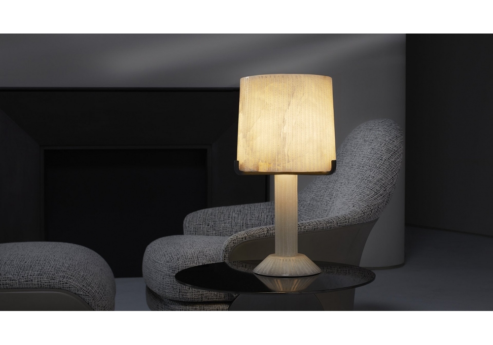 Acropolis diseñada por CTO Lighting es una lámpara de mesa realizada en alabastro blanco con detalles en acero negro.