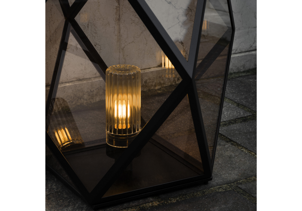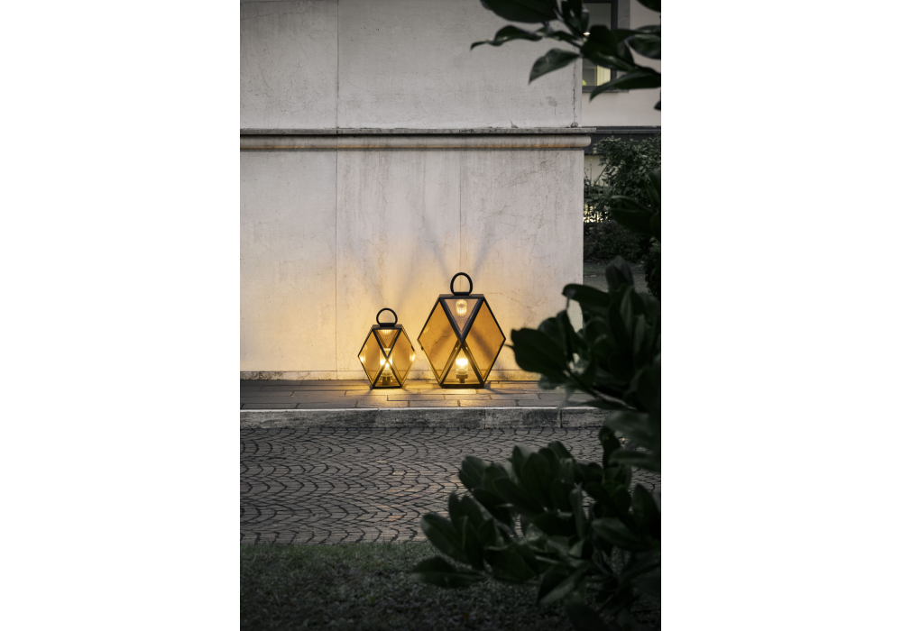 Muse diseñada por Tristan Auer para Contardi es una lámpara de mesa o de pie con estructura metálica, asa de cuero trenzado marrón y difusor de plexiglás ámbar. El cable negro incluye un conector para exteriores con clasificación IP68. Apta para uso en interiores y exteriores.