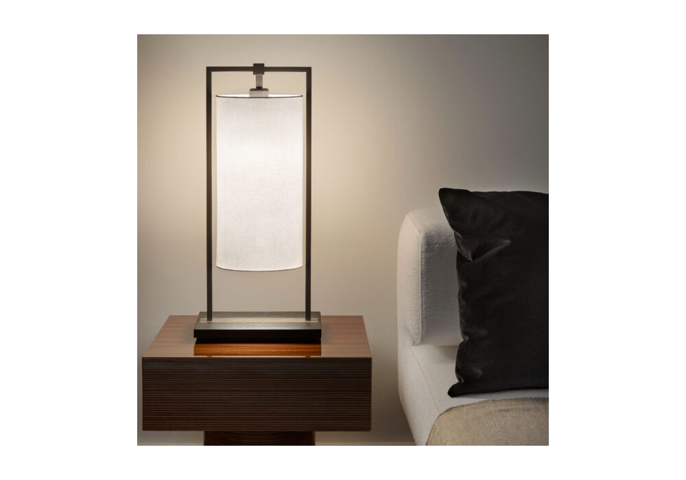 Athena diseñada por Massimiliano Raggi para Contardi es una lámpara de mesa con base cuadrangular en roble teñido marrón oscuro y estructura portante en bronce cepillado. La pantalla de la lámpara es realizada en tejido cilíndrico de lino blanco y protege una fuente de luz LED.