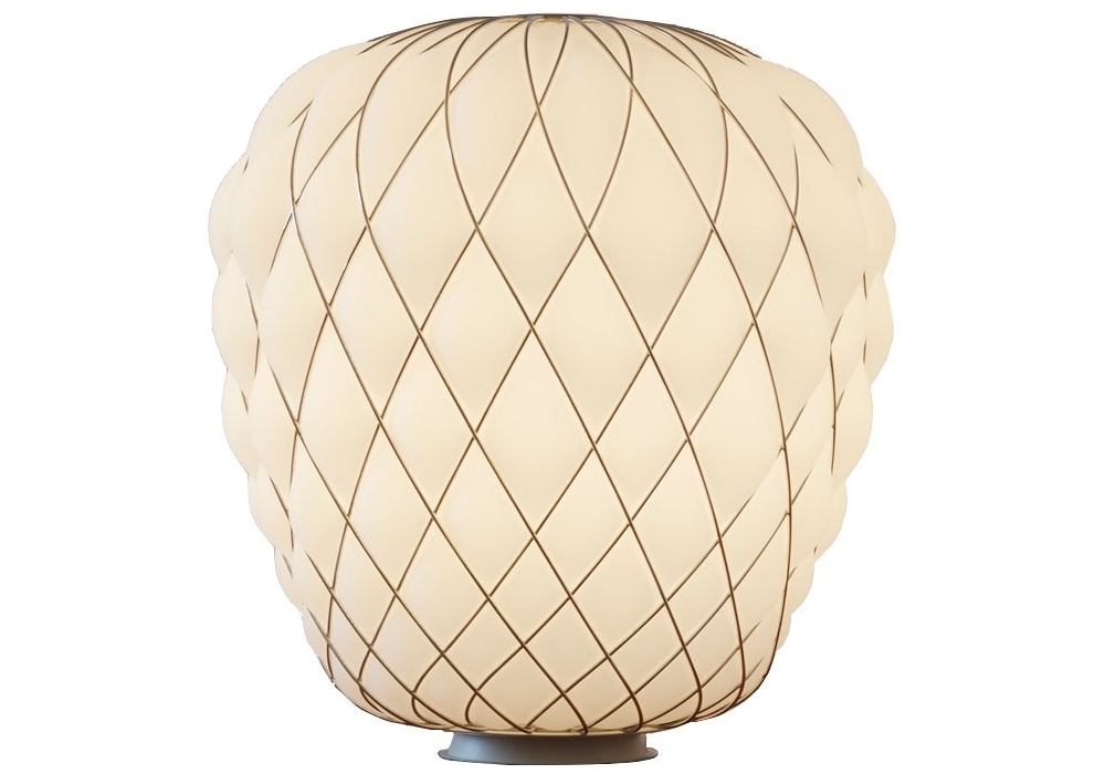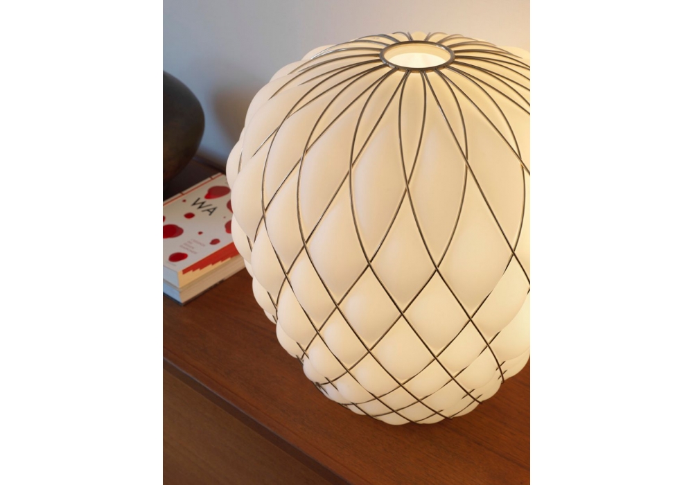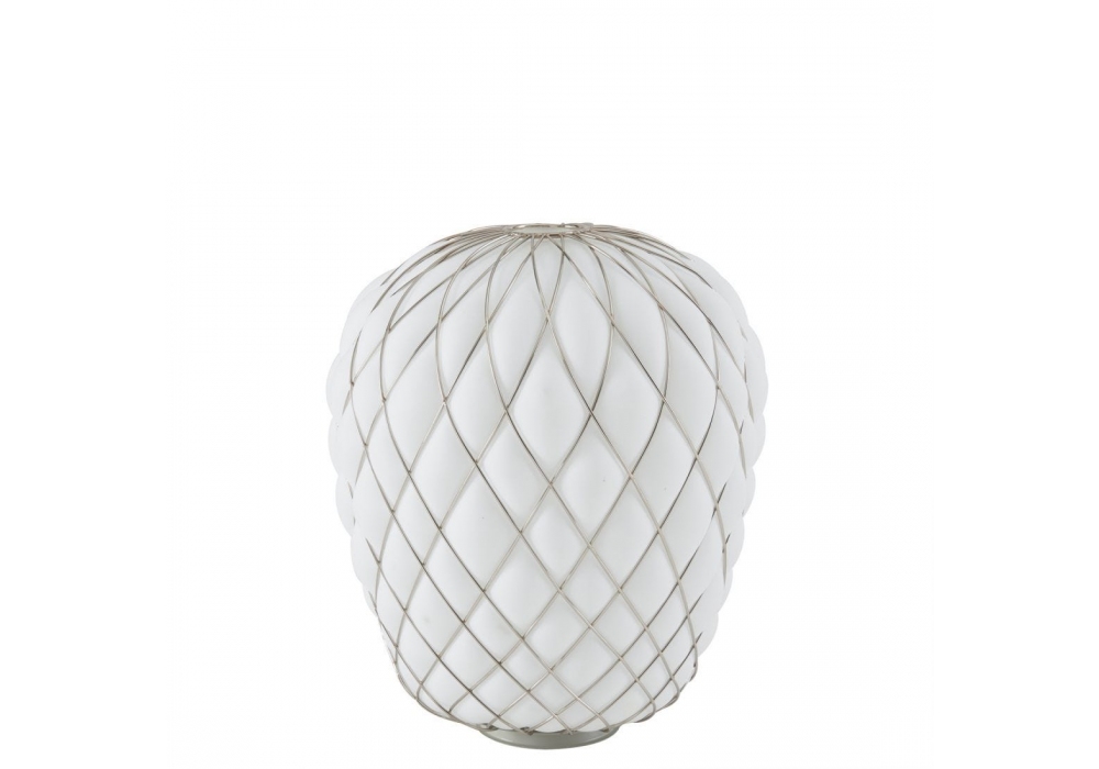 Pinecone diseñada por Paola Navone para Fontana Arte es una lámpara de mesa con difusor de vidrio soplado transparente o blanco opalino. Jaula de metal cromado o chapado en oro. Cable de alimentación, dimmer y clavija transparentes. También disponible en 2 diferentes dimensiones.