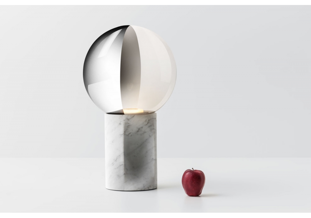 Je Suis diseñada por Carlo Colombo para Penta es una lámpara de mesa LED con estructura en madera o mármol blanco de Carrara. El difusor esférico se puede girar 360° y está estructurado en vidrio soplado bicolor blanco/plata.