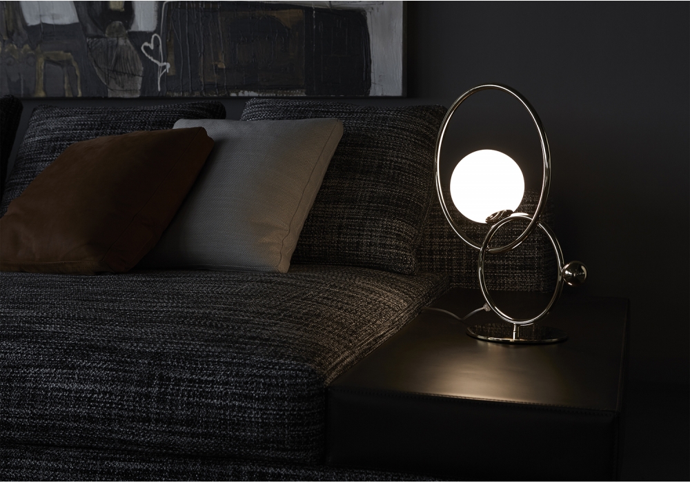 Zoe Table diseñada por Melissa Lunardi y Massimo Tonetto para Venicem es una hermosa lámpara de mesa hecha de dos anillos de metal con un difusor de vidrio soplado Murano. Este producto está disponible en dos acabados diferentes.
