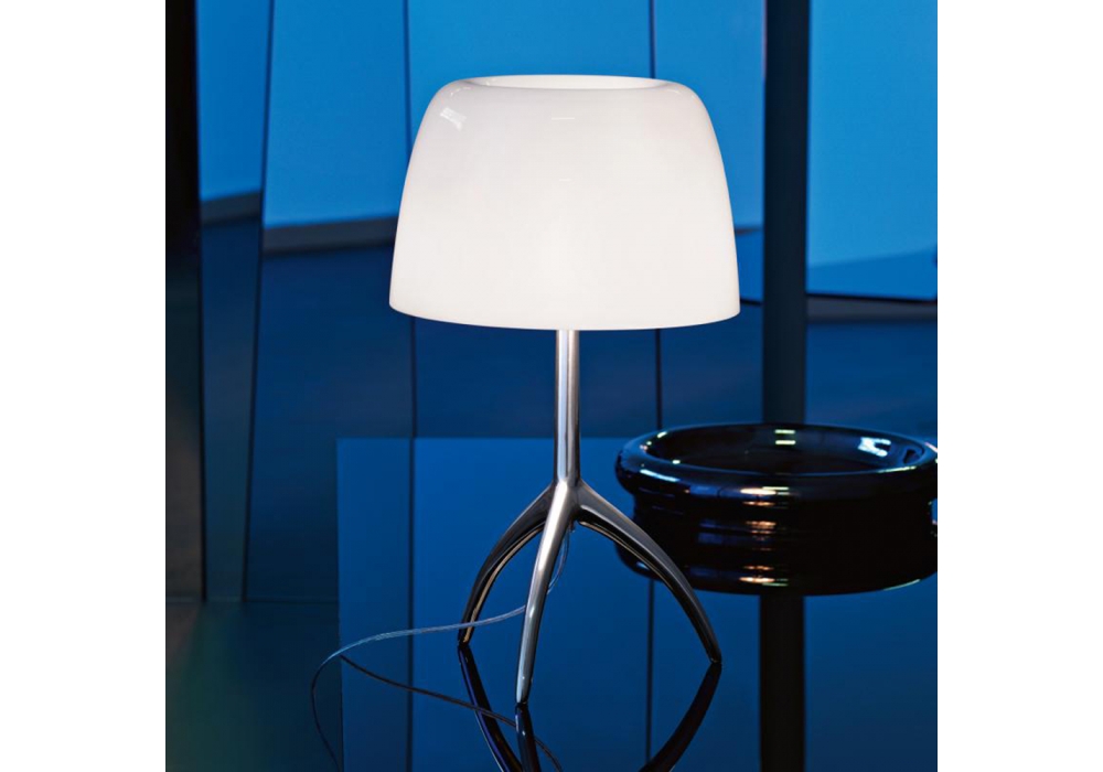 Lumiere diseñada por Rodolfo Dordoni para Foscarini es una lámpara de mesa con estructura portante y base en aluminio cepillado y pintado. El difusor es circular en vidrio soplado y protege una fuente de luz LED retrofit alimentada por un cable de plástico transparente. Lumiere está disponible en diferentes modelos y acabados.