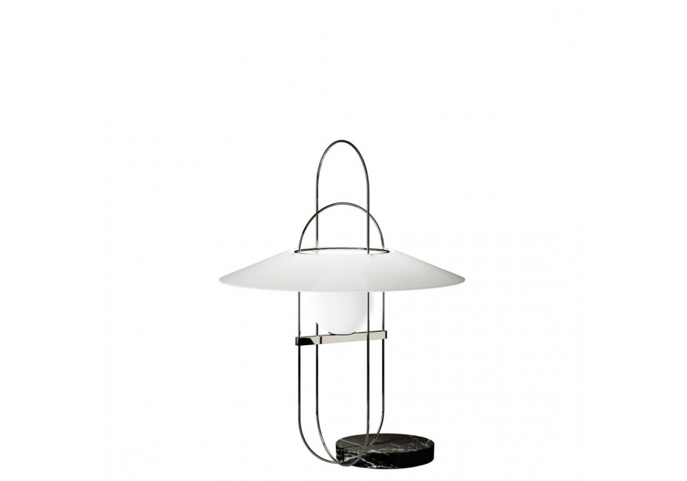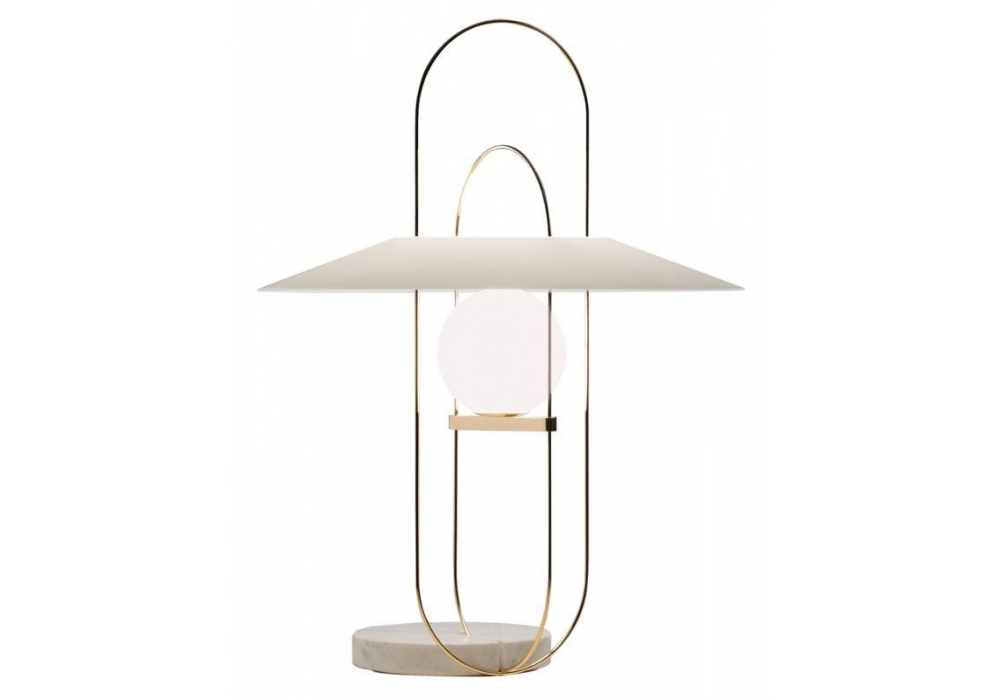 Setareh High diseñada por Francesco Librizzi para Fontana Arte es una lámpara de mesa de luz difusa regulable con estructura en metal galvanizado. Base en mármol de Carrara para la versión dorada y en gris Carnico para la versión negra. Difusor esférico de vidrio soplado satinado opal y difusor superior abocinado pintado interiormente y satinado exteriormente. Cable de alimentación, atenuador y enchufe negros. Disponible en diferentes acabados.