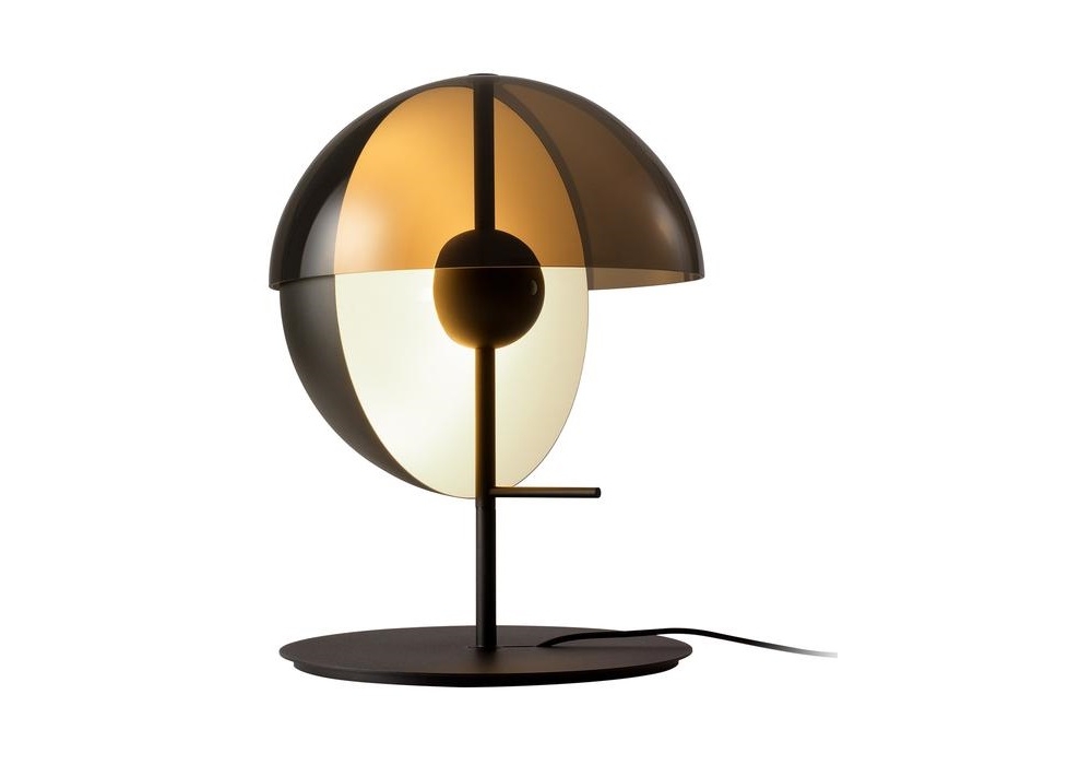 Theia M diseñada por Mathias Hahn para Marset es una lámpara de mesa con base y tija de hierro lacado. Disipador en aluminio lacado con interruptor integrado. Semiesfera vertical de hierro lacado con interior en blanco y pantalla de metacrilato termoconformado transparente fumé. También disponible en 2 diferentes acabados: blanco o negro.