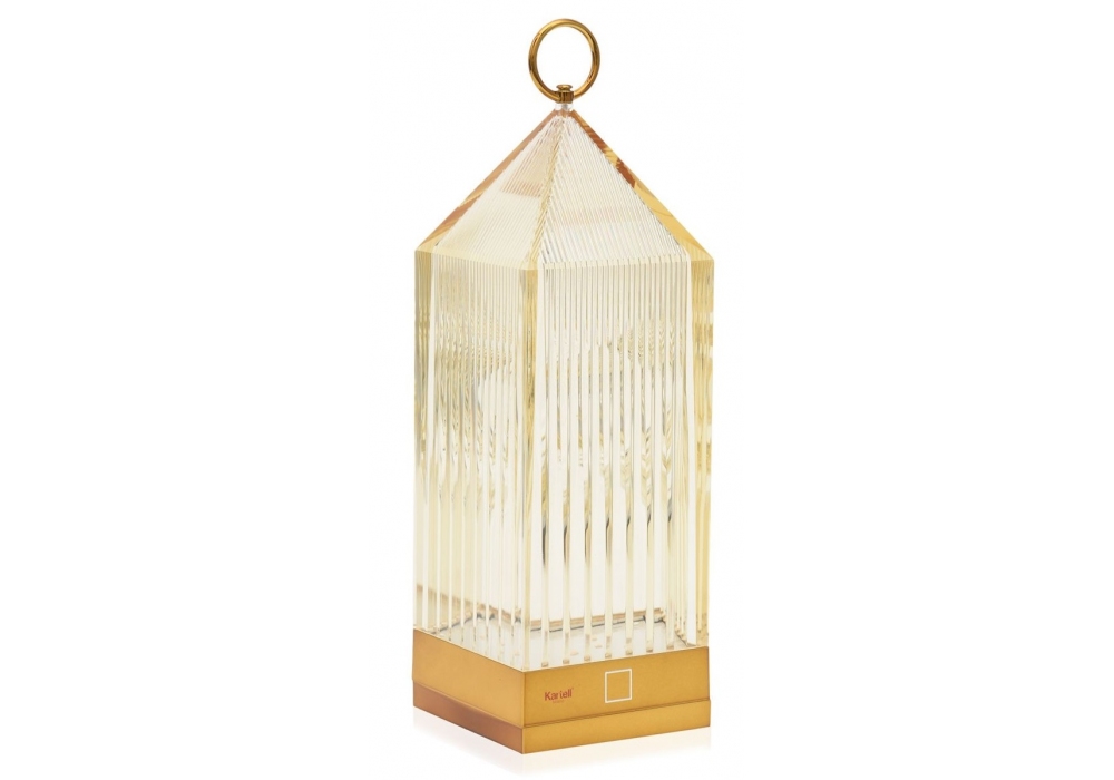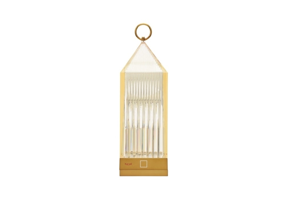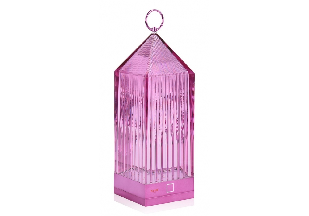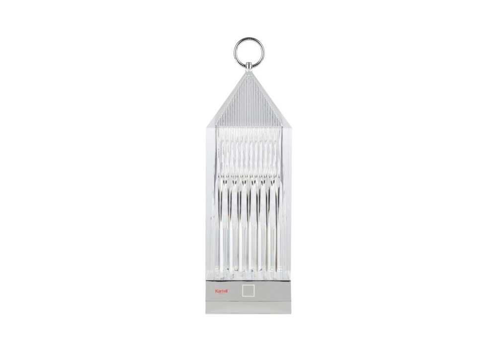Lantern diseñada por Fabio Novembre para Kartell es una original lámpara de mesa led portátil, un "farol recargable" transparente, moldeado por inyección, que se recarga apoyándose en una base conductora. La luz se proyecta gracias a un efecto gráfico del diseño.