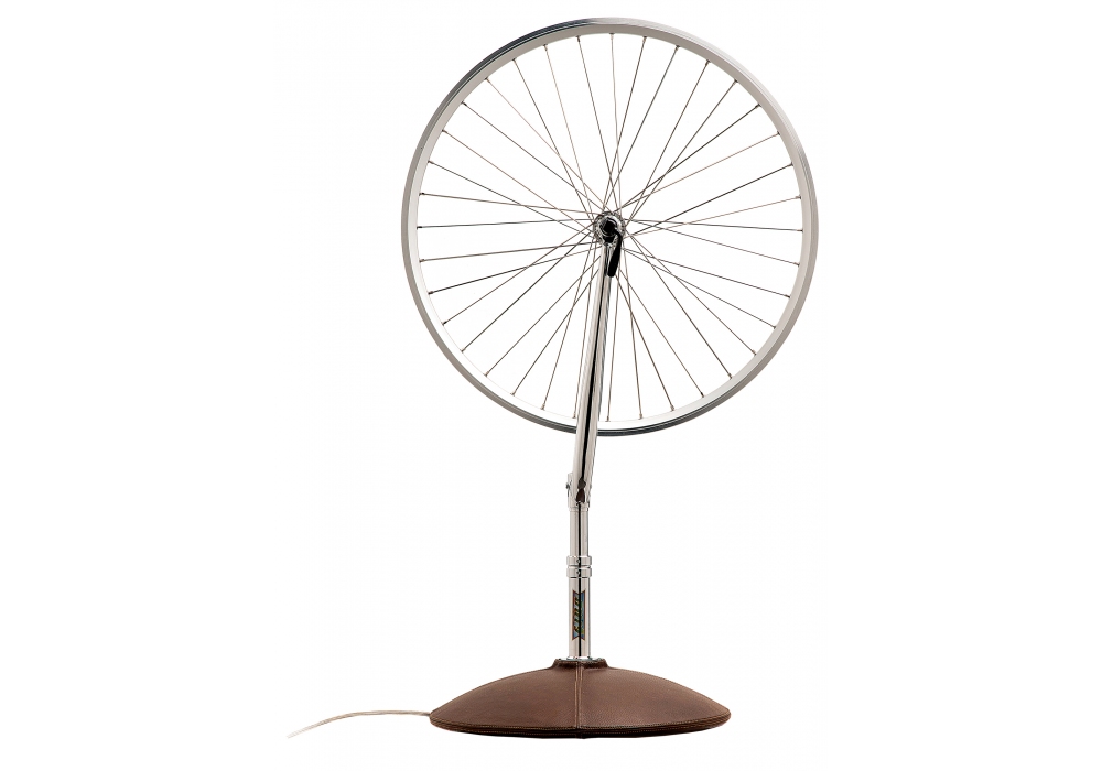 Gino, diseñada por Fabio Antinori para Cyclampa, es una lámpara de mesa de aluminio. La lámpara consiste en una rueda de aluminio fundida a troquel original. Ledstrip de alta capacidad, equipado con chip de control térmico integrado. Cuerpo de acero cromado (componente original de la horquilla), interruptor infinito, tapa de aluminio con funda de cuero ecológico cosida a mano.